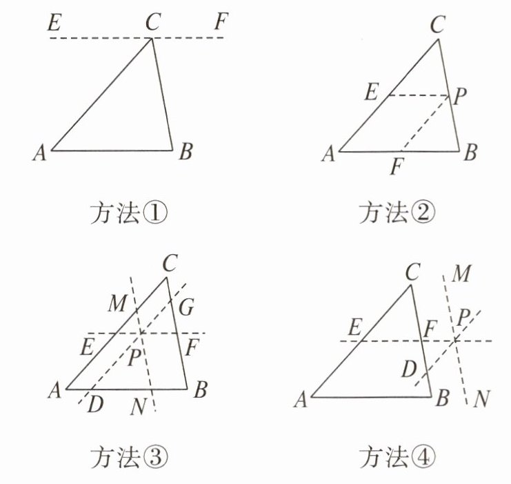 方法④:点P在△ABC的外部,过点P作EF//AB分别交AC,BC于点E,F,作DP//AC交BC于点D,作MN//BC。