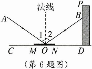 6. 如图,平面镜MN放置在水平地面CD上,墙面PD⊥CD于点D,一束光线AO照射到镜面MN上,反射光线为OB,点B在PD上,法线垂直于地面,∠1= ∠2. 若∠AOC= 35°,则∠OBD的度数为(