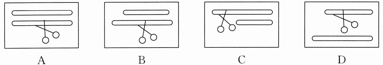 3. 如图,每个盒子里都有两根小棒,把其中的一根小棒用剪刀按图中的位置剪成两段,这两段小棒再与另一根小棒首尾相接,能够围成一个三角形的是(