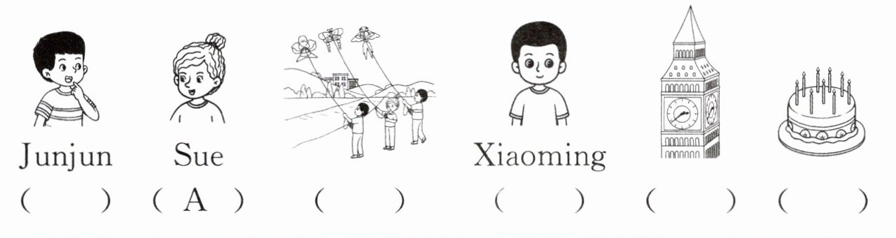 五、听短文,排顺序。请根据你听到的短文内容,将下列图片按照A、B、C、D、E、F的顺序排列,并将字母标号填入图下括号内。其中A选项已给出。短文读两遍。