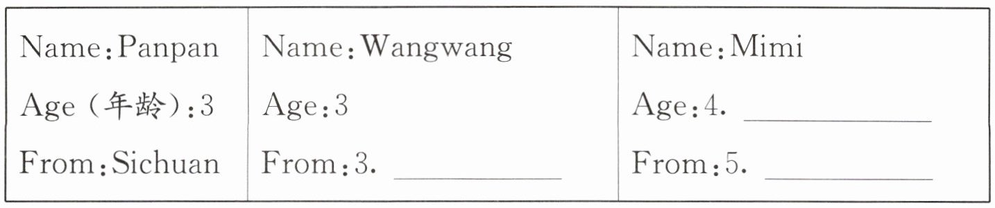 Hi,everyone. My name is Panpan. I’m a panda(大熊猫). I’m 3. And I’m from Sichuan. I have 2 friends. This(这)is Wangwang. He’s 3,too. And he’s from Guangxi. This is Mimi. She is 2. And she’s from Hunan. We’re good friends. We play together.
