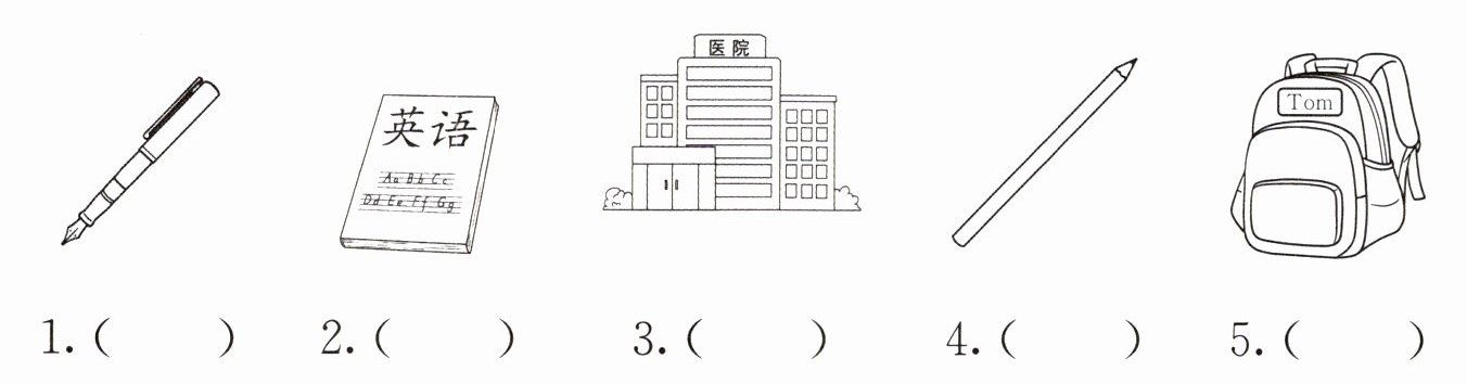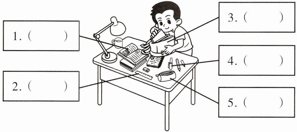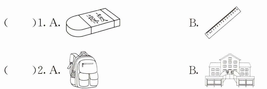 一、大明一边整理自己的书包,一边唱着歌谣。请根据歌谣内容,将图片中的学习用品按照 A、B、C、D、E 的顺序排列。歌谣读两遍。