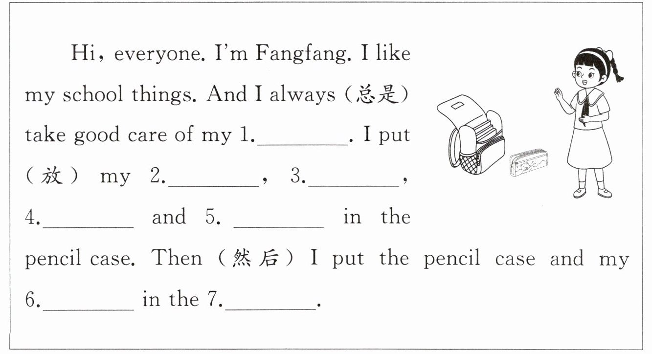芳芳正在整理她的书包,看看她是如何整理和介绍的。请从方框中选出恰当的词语补全短文,并将其字母标号填在横线上。
