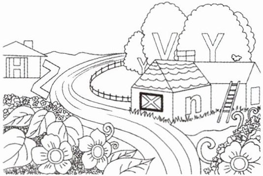 火眼金睛。你能找出隐藏在图中的字母吗?请在图中圈出你所找到的字母,并将该字母准确地书写在下面的四线三格内。每个字母写一遍。