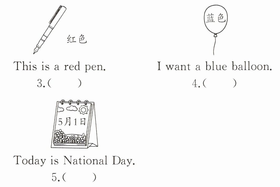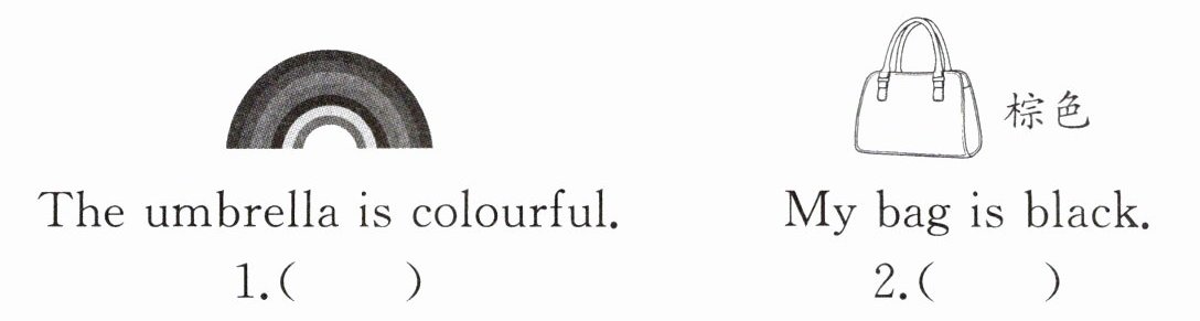 二、看图,读句子,判断所给图片与句子意思是否相符,相符的在括号内写“T”,不相符的写“F”。