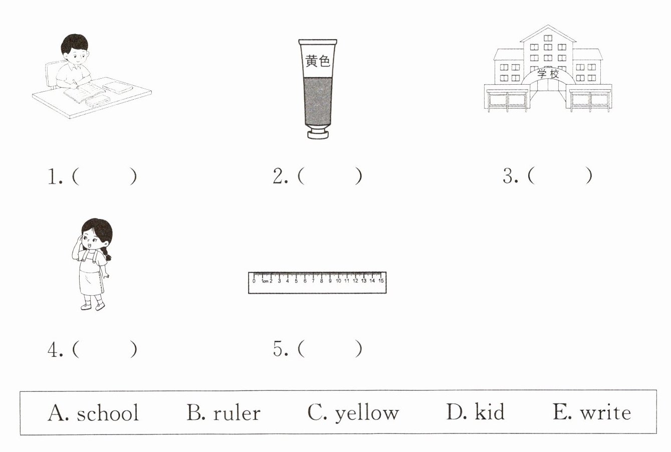 一、看图,认词语。请根据所给的图片,从方框中找出相对应的词语,并将词语前的字母标号填入图下括号内。
