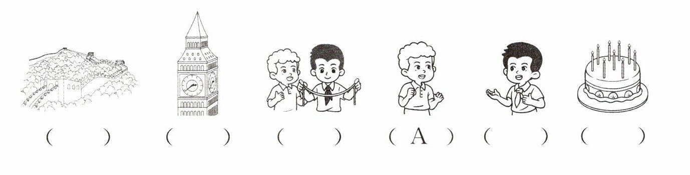 五、听短文,排顺序。请根据你听到的短文内容,将下列图片按照A、B、C、D、E、F的顺序排列,并将字母标号填入图下括号内。其中A选项已给出。短文读两遍。