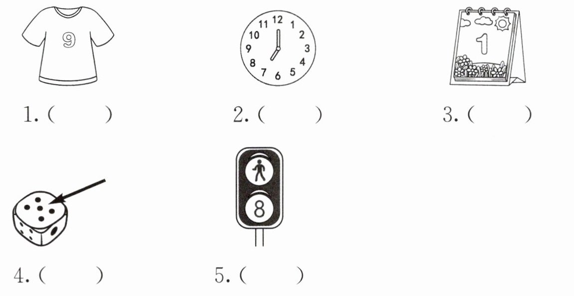 一、看图,认词语。请根据所给的图片,从方框中找出相对应的数字词语,并将词语前的字母标号填入图下括号内。