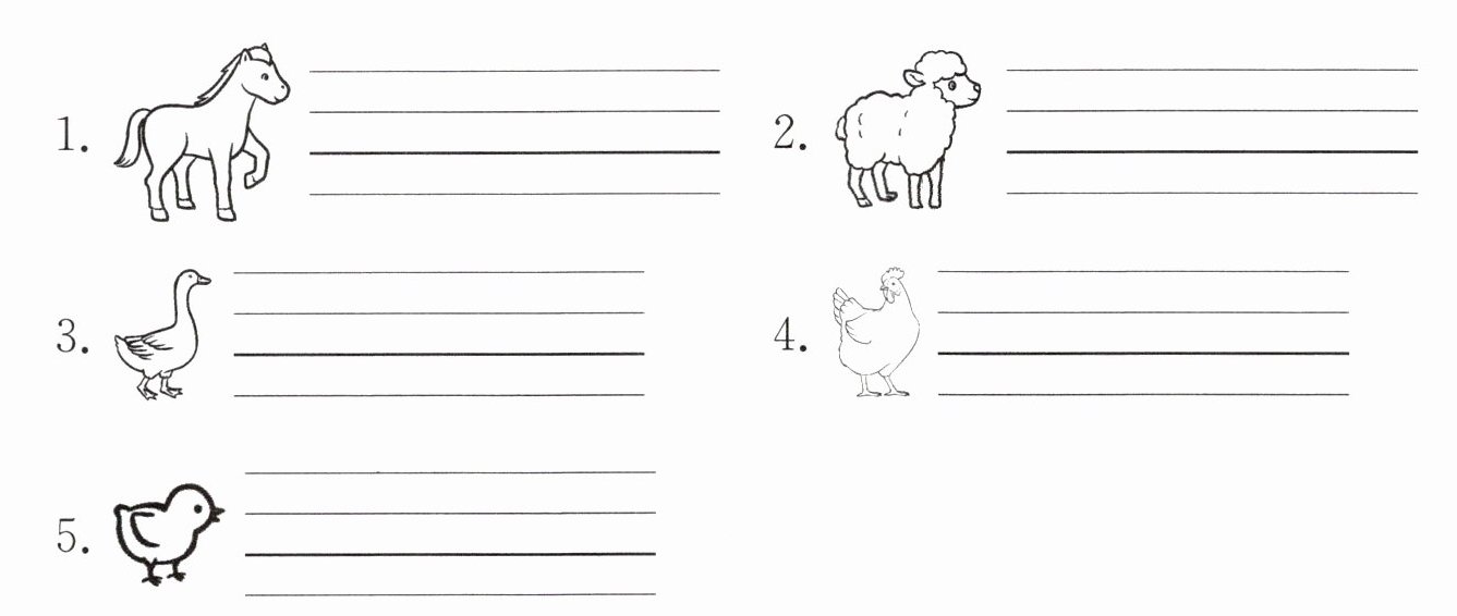 二、农场里有许多小动物,请仔细观察图片,数清楚每种小动物的数量,从方框中找出数字的英文单词,并在相应的四线三格内写出来。