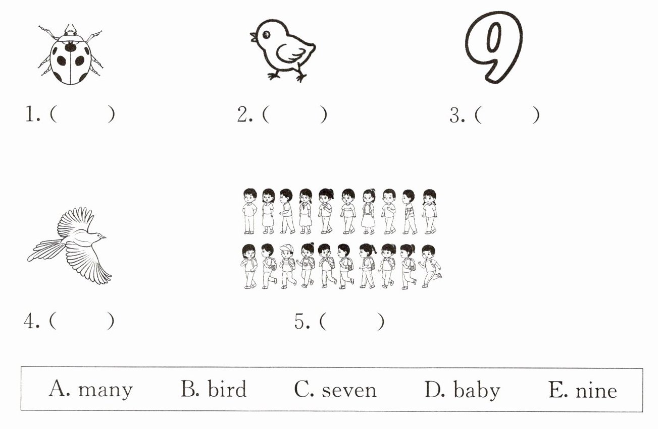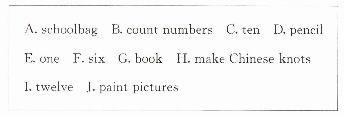 一、看图,认词语。请根据所给的图片,从方框中找出相对应的词语,并将词语前的字母标号填入图下括号内。
