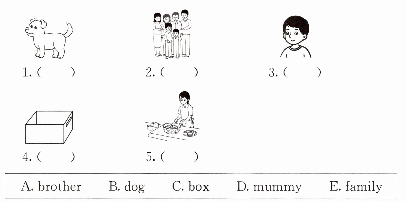 一、看图,认词语。请根据所给的图片,从方框中找出相对应的词语,并将词语前的字母标号填入图下括号内。