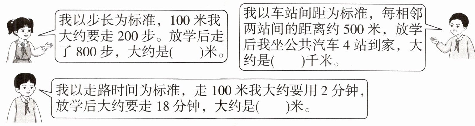 3. 估一估下面的小朋友从学校到家的距离,填一填。