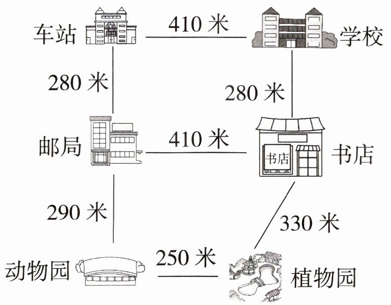 3.最近路线:学校—书店—植物园—动物园 280+330+250=860(米)(图略)