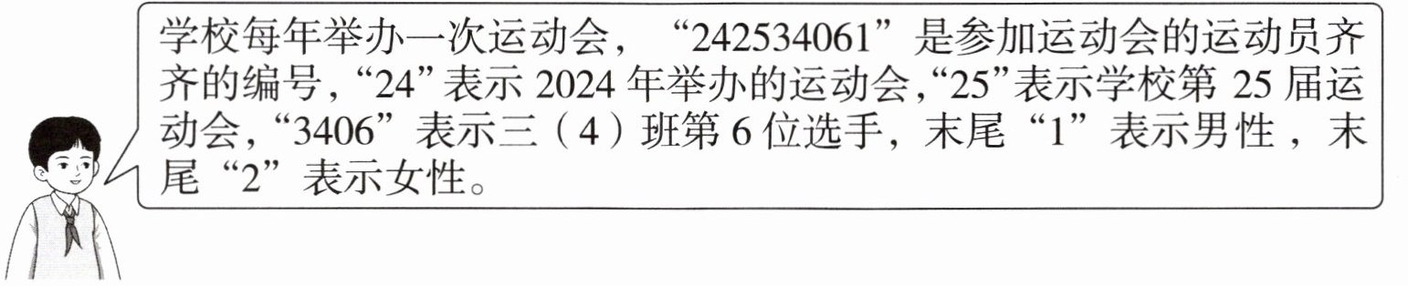 (1)如果小明2025年作为三(3)班的第10位选手参加运动会,那么他的编号为$□□□□□□□□□$。