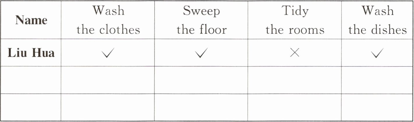 任务一表格(除Liu Hua外)空;任务二 1. wash the dishes 2. sweep the floor(答案不唯一,合理即可)