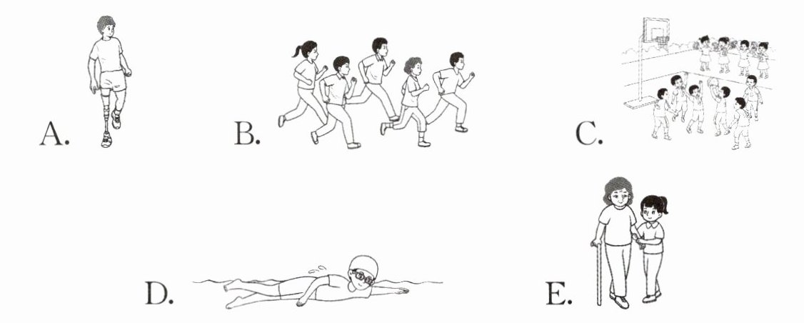 二、图文匹配。请根据下列描述选择与其意思相符的图片,并将其字母标号填入题前括号内。