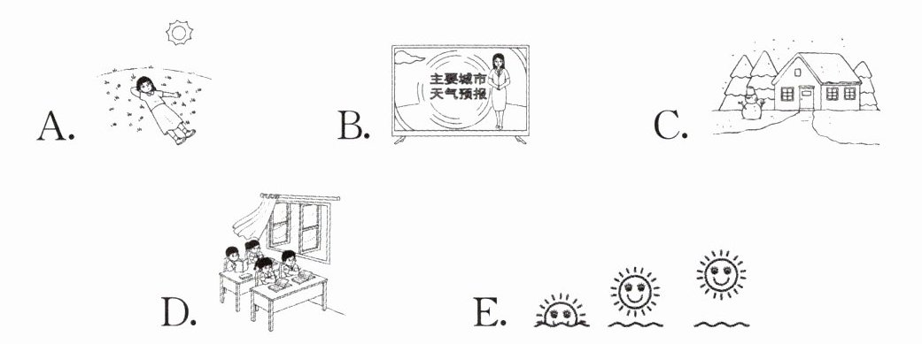 三、图文匹配。请根据下列描述选择与其意思相符的图片,并将其字母标号填入题前括号内。