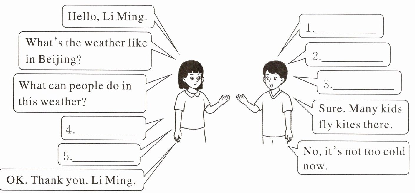 四、李明和陈玲正在谈论北京的天气以及人们在这种天气下进行的活动。请你联系上下文,从方框中选择恰当的句子补全对话,并将其字母标号填在相应的横线上。