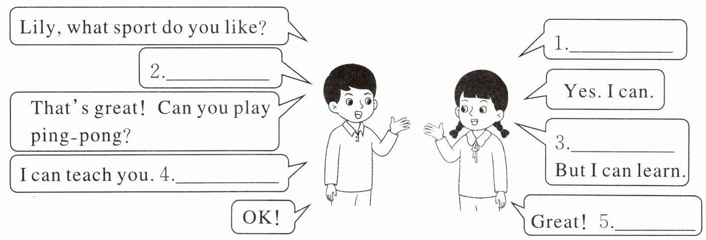 四、莉莉和朋友正在谈论喜欢的运动。请你联系上下文,从方框中选择恰当的句子补全对话,并将其字母标号填在相应的横线上。