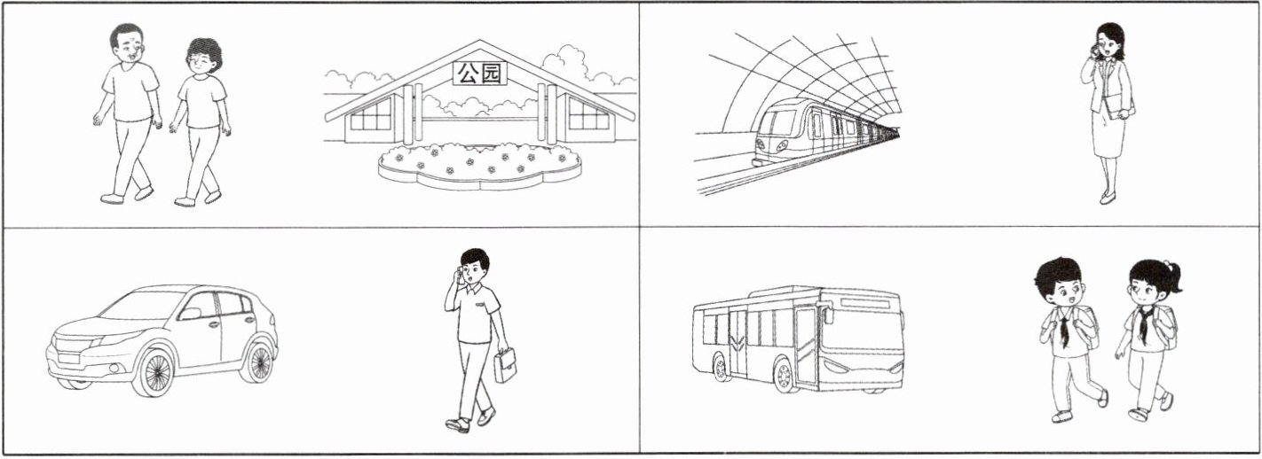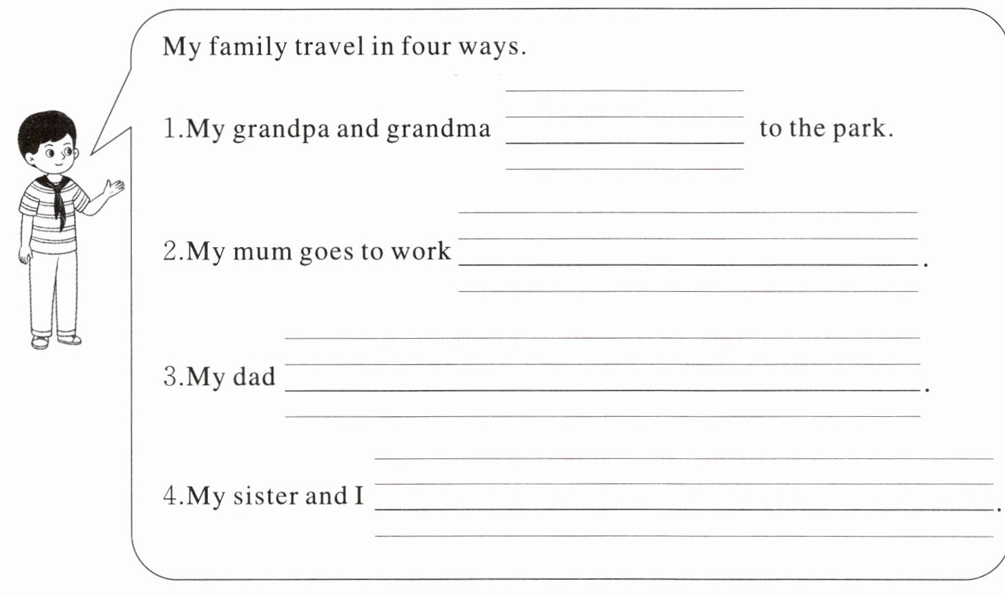 李林画了一幅关于家人出行方式的图画。请你根据图画内容,帮助李林完成对这幅图画的介绍,准确地书写在四线三格内。