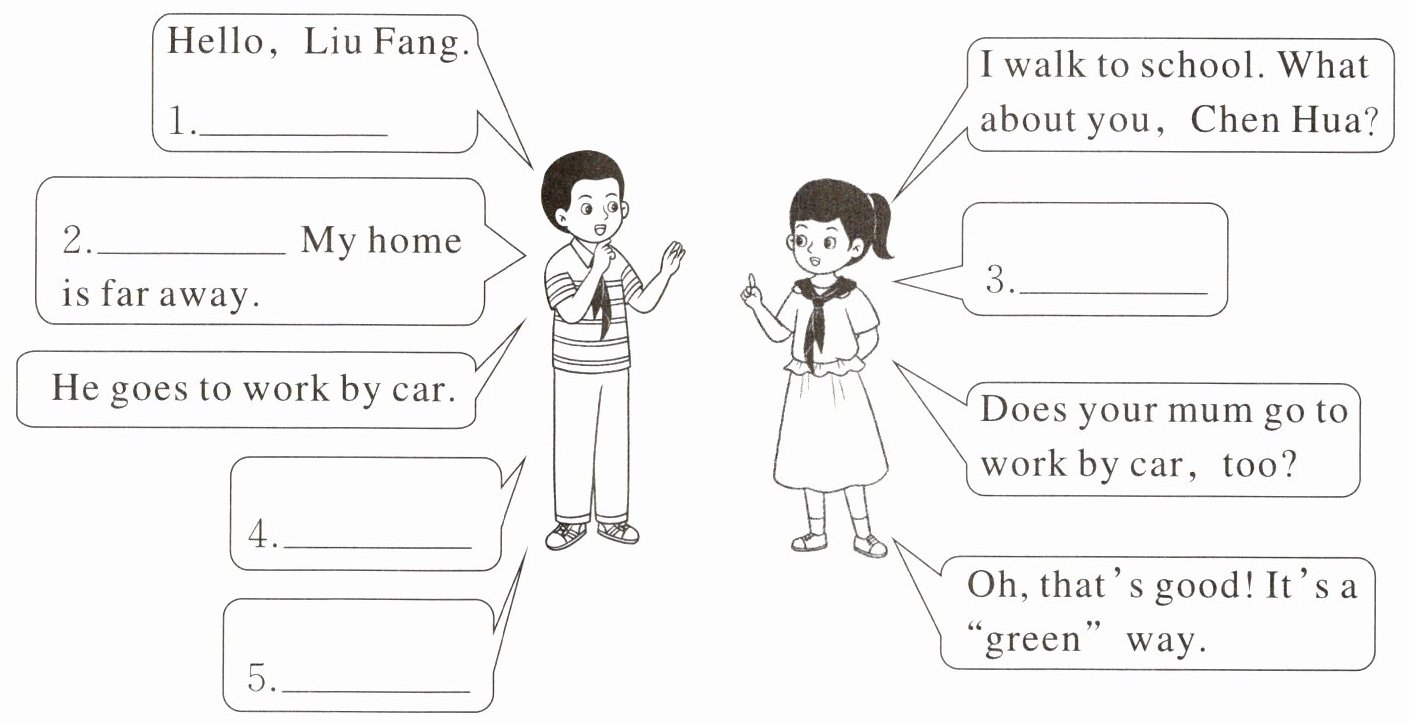 四、刘芳和陈华正在谈论自己及家人的出行方式。请你联系上下文,从方框中选择恰当的句子补全对话,并将其字母标号填在相应的横线上。