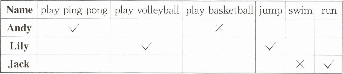 1. play ping-pong 2. can't 3. volleyball 4. jump 5. swim