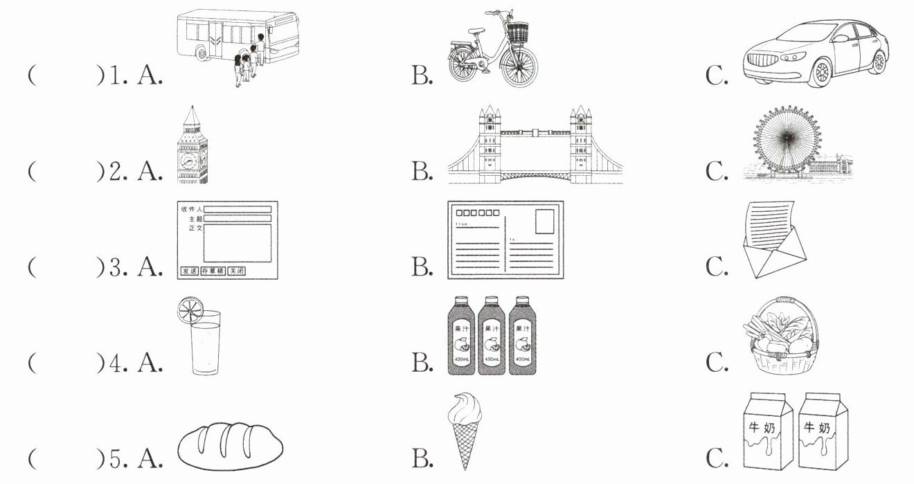 三、听对话,选图片。请根据你所听对话内容,选出正确的图片,并将其字母标号填在括号中。每段对话读两遍。