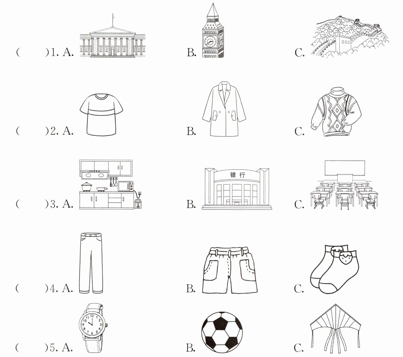 一、听句子,选图片,请选出与你所听句子意思相符的图片,并将其字母标号填在括号中。每个句子读两遍。