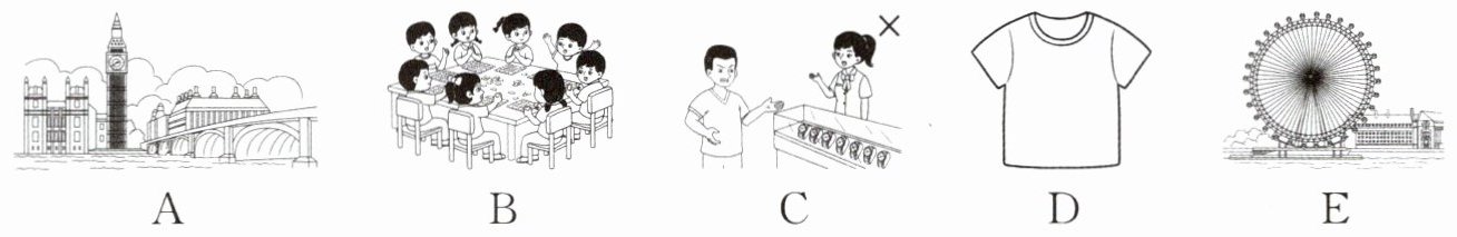 三、图文匹配。请根据下列描述,选择与其意思相符的图片,并将其字母标号填在括号中。