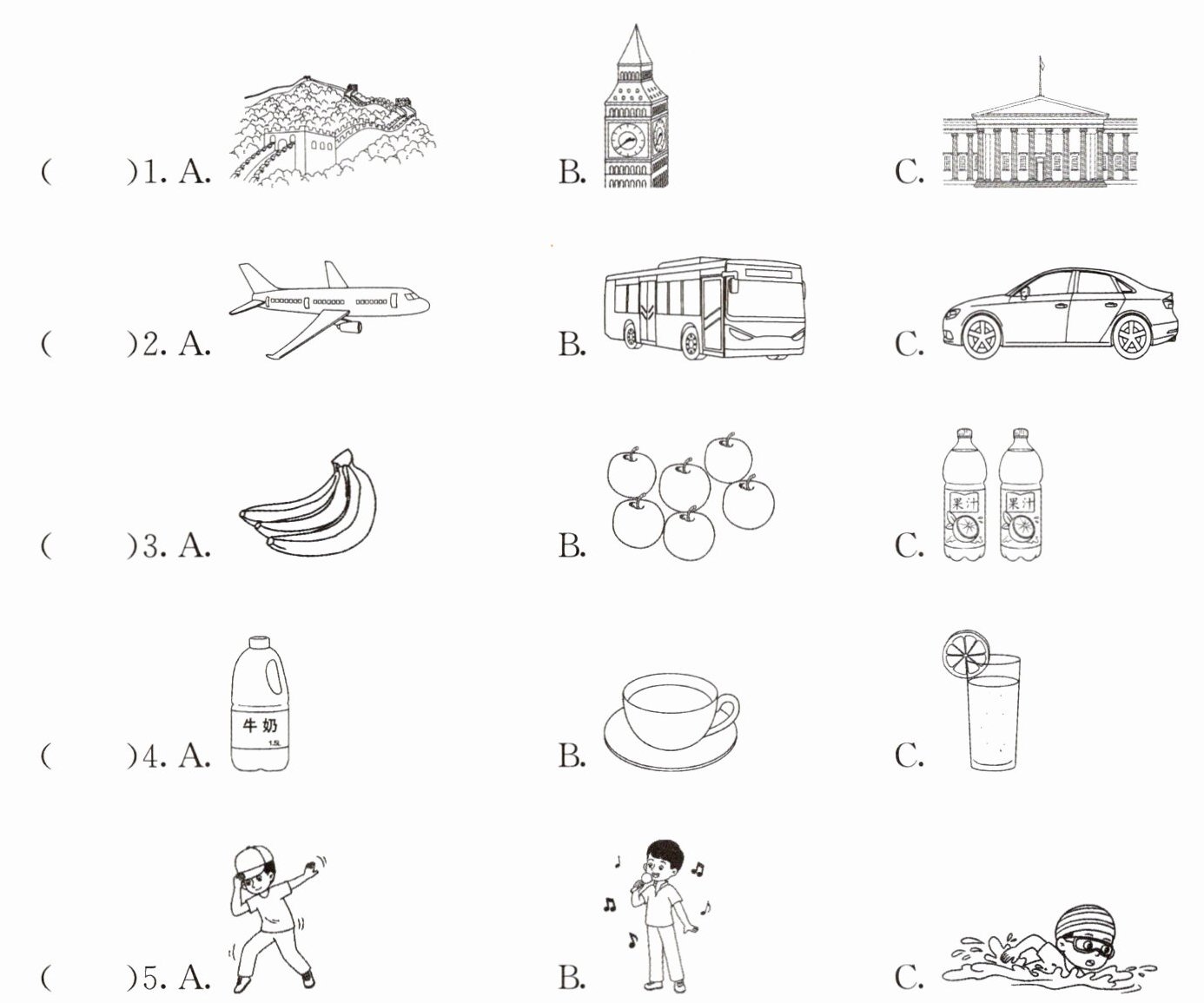 一、听句子,选图片。请选出与你所听句子意思相符的图片,并将其字母标号填在括号中。每个句子读两遍。