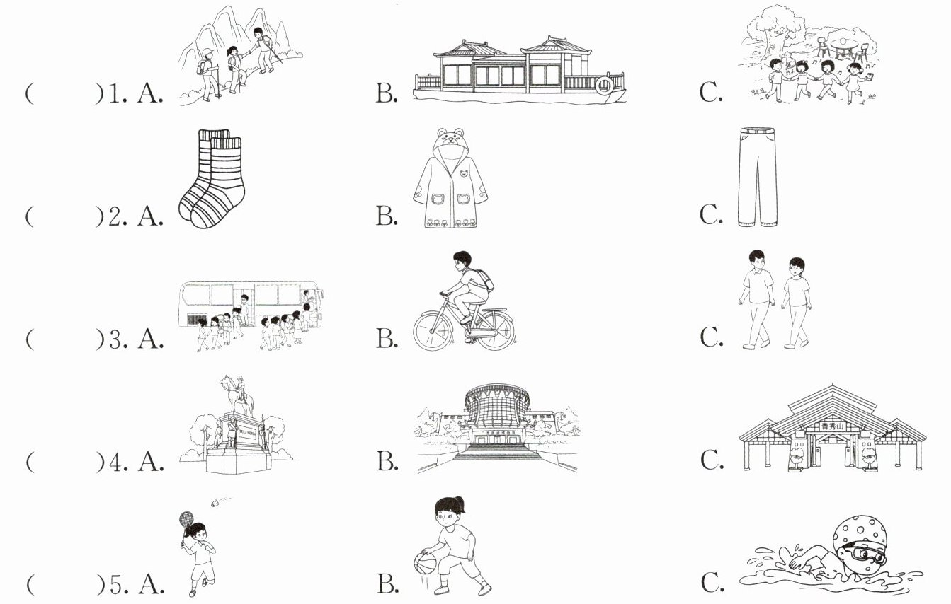 三、听对话,选图片。请根据你所听对话内容,选出正确的图片,并将其字母标号填在括号中。每段对话读两遍。