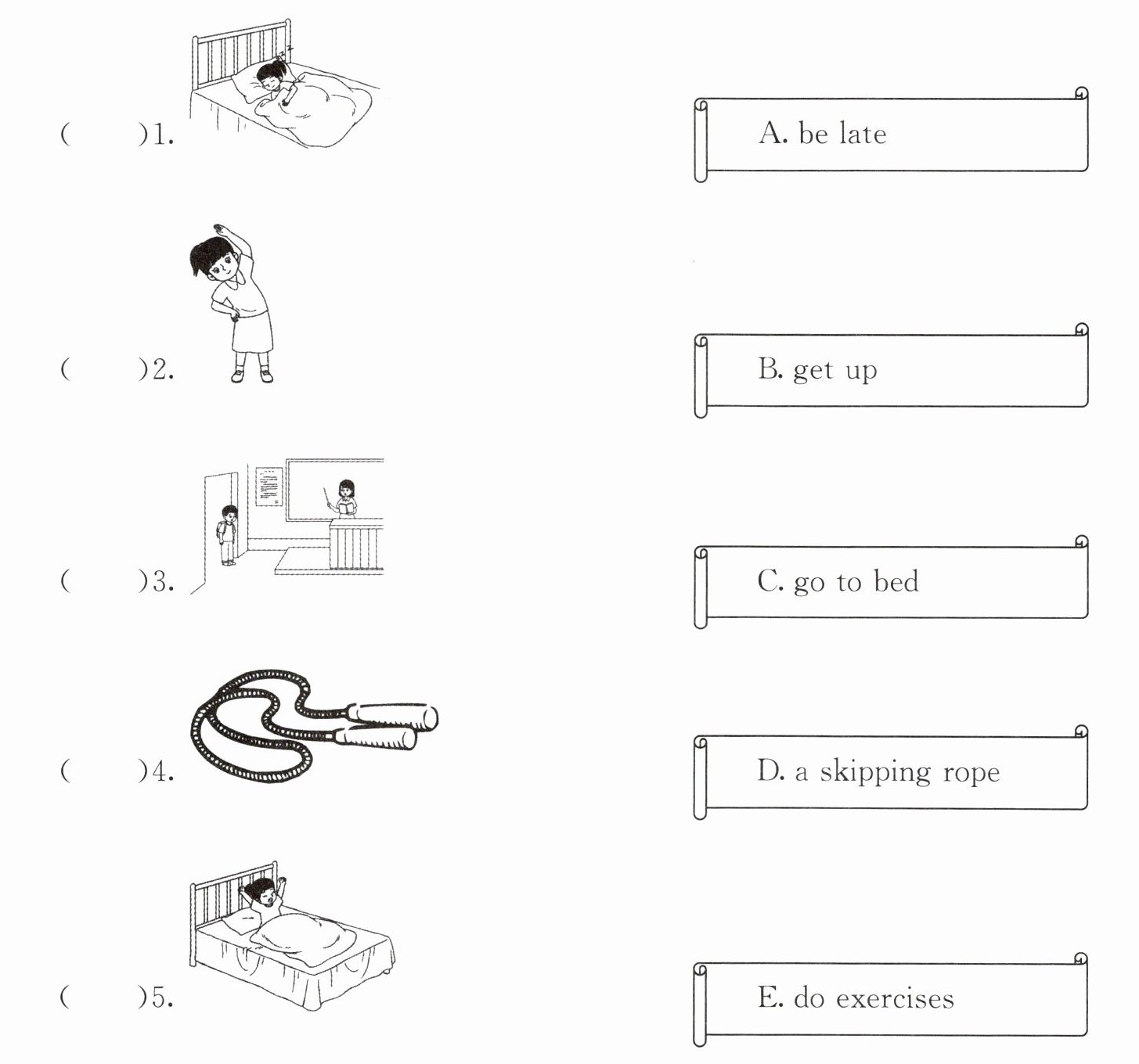 三、根据图片内容,选出正确的短语,并将其字母标号填在括号中。