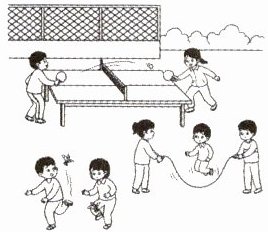 三、根据图片内容,选出正确的单词或短语完成句子,并将其字母标号填在括号中。