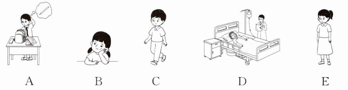 二、图文匹配。请根据下列描述,选择与其意思相符的图片,并将其字母标号填在括号中。