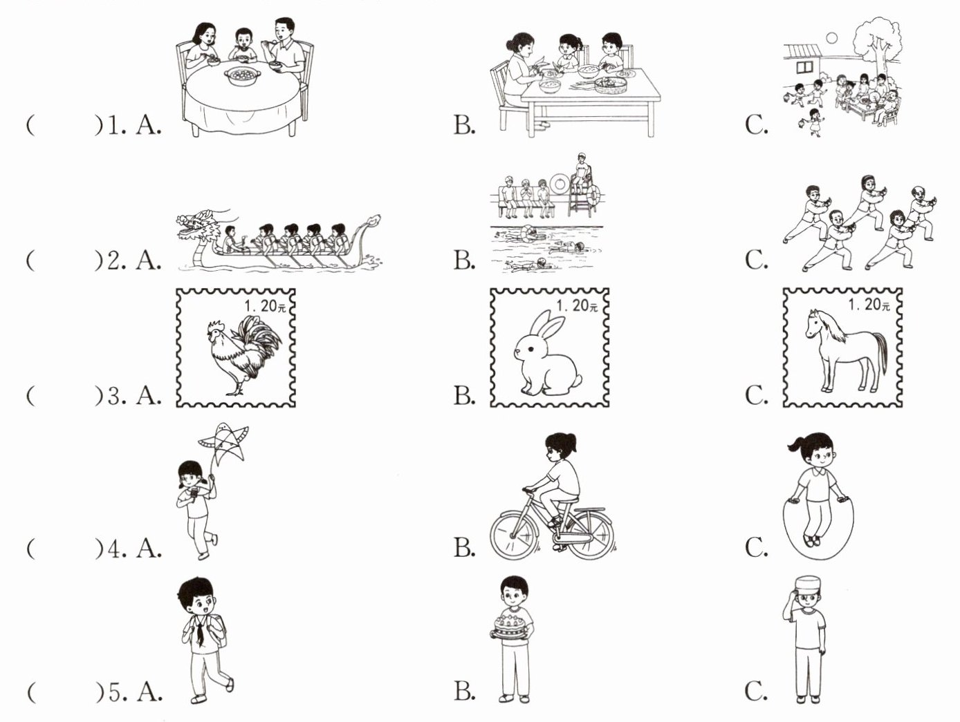 二、听对话,选图片。请根据你听到的对话内容,选出正确的图片,并将答案的字母标号填在括号中。每段对话读两遍。