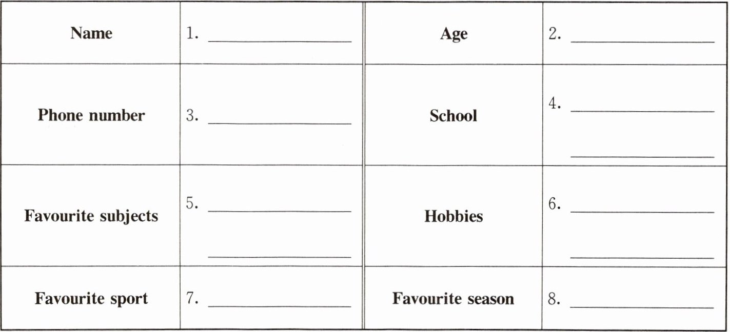 任务二:1. Liu Tao 2. twelve/12 3. 82011853 4. Liuyuan Primary School 5. Maths and PE 6. collecting stamps and taking photos 7. swimming 8. summer