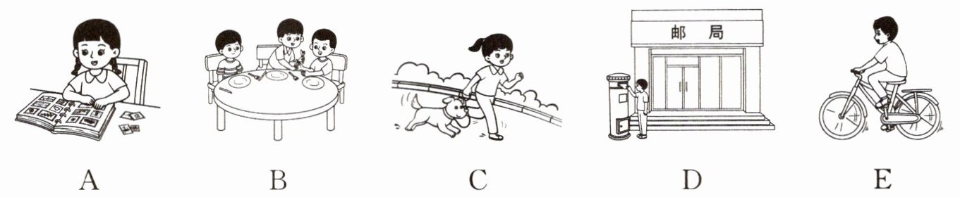四、图文匹配。请根据下列描述选择与其意思相符的图片,并将答案的字母标号填在括号中。