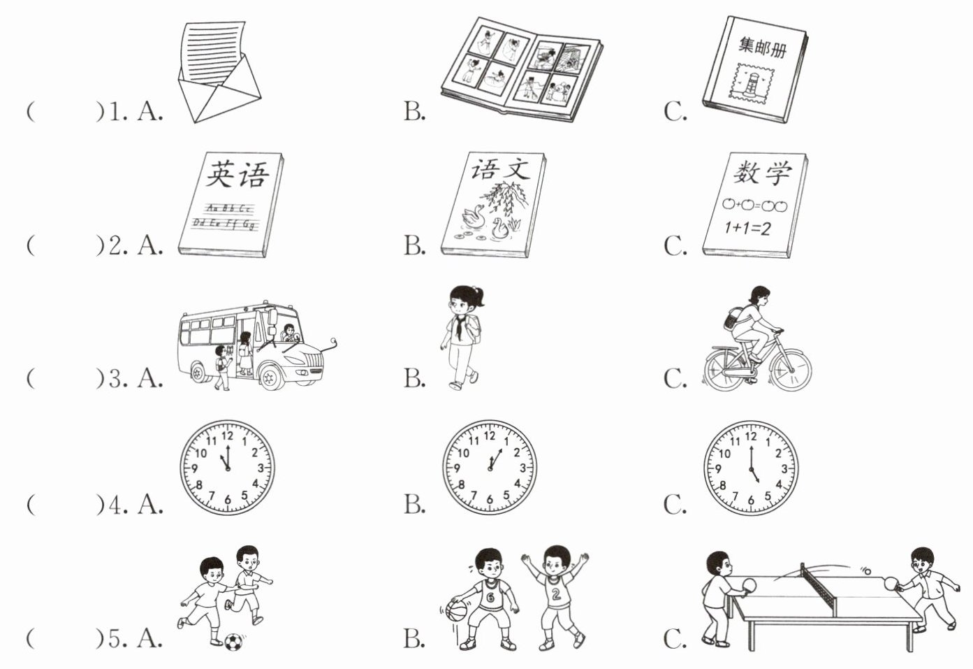 二、听对话,选图片。请根据你听到的对话内容,选出正确的图片,并将答案的字母标号填在括号中。每段对话读两遍。