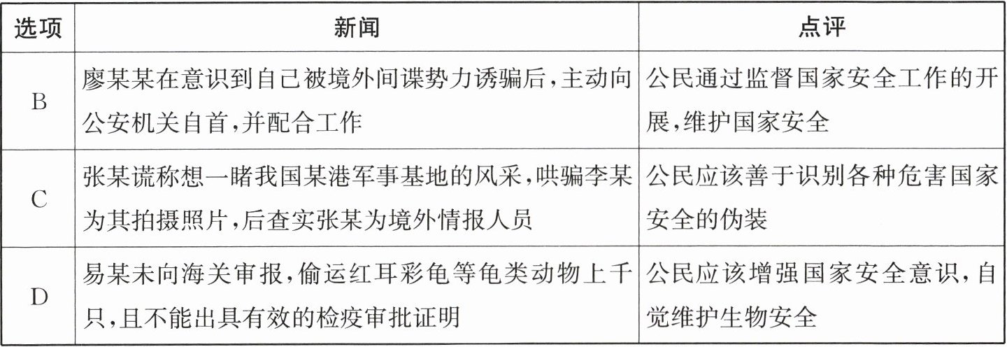 B 【解析】本题考查总体国家安全观。国家安全与我们息息相关,我国国家安全的内涵和外延比历史上任何时候都要丰富,面对日益复杂、严峻的安全形势,必须坚持总体国家安全观,要统筹维护和塑造国家安全,构建涵盖诸多领域的国家安全体系,①②④说法正确;国家安全包括国家的主权、领土完整不受侵犯,国家的机密不被窃取、泄露和出卖,社会秩序不被破坏等,③说法错误。故选B项。