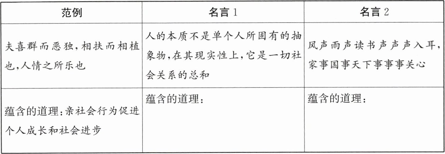 (1)示例 名言1:①这句话体现了人是社会的人。我们都是社会的一员,每个人在社会中都有其相应的位置。人的身份是在社会关系中确定的。②我们要积极融入社会,养成亲社会行为。名言2:我们要主动了解社会,关注社会变化发展;了解风俗习惯,遵守社会公德,积极融入社会生活;热心帮助他人,积极投身于社会实践,以聪明才智贡献国家,以开拓进取服务社会。