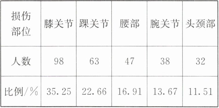 10. 冬季滑雪项目成为许多人休闲娱乐的选择。但是,热身活动不充分或姿势不当,容易在滑雪过程中出现各种运动损伤。研究者对某地 10 家滑雪场进行调查,对 278 名滑雪受伤者损伤部位进行统计(如下表)。根据数据能得出的正确结论是( )。