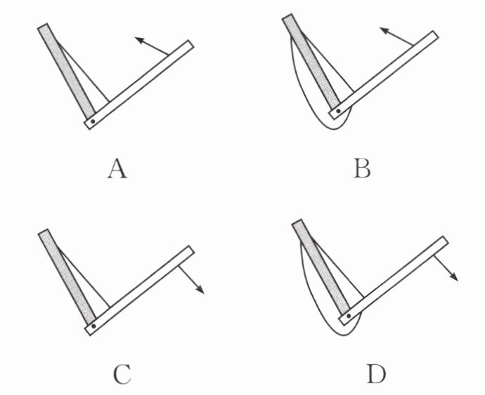 14. (2024·广西)某生物兴趣小组利用硬纸板(代表骨)、适当长度的松紧带(代表肌肉)和几个工字钉(代表关节),制作肌肉牵动骨运动的模型,箭头表示前臂运动的方向。下列能正确模拟屈肘动作的是( )。