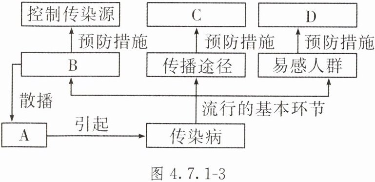 (2)若图4.7.1-3是流感流行的基本环节及其预防的知识结构图,流感病毒是引起感冒的[ ]______,流感患者属于[ ]______。