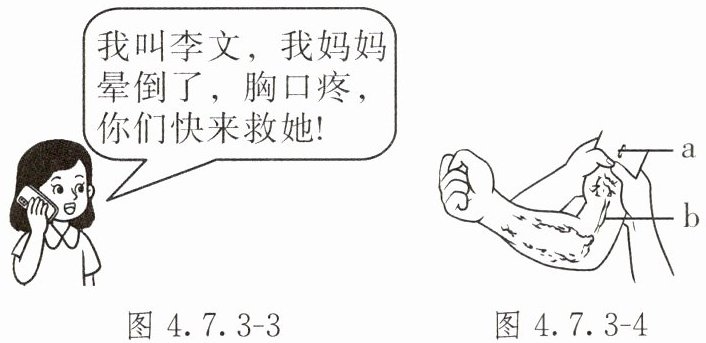 (2)某人外出血时,血液呈暗红色,从伤口缓慢而连续不断地流出,这是______(填血管名称)出血。图 4.7.3 - 4 表示救护者采取指压止血法急救,由此判断伤口在______(填“a”或“b”)处。