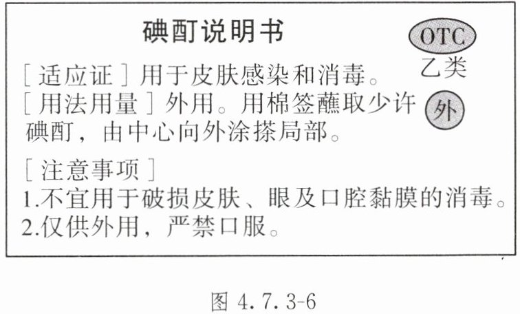 13. (2024·广西)图 4.7.3 - 6 是家庭常用药碘酊的说明书的部分内容。下列用药方式不安全的是( )。