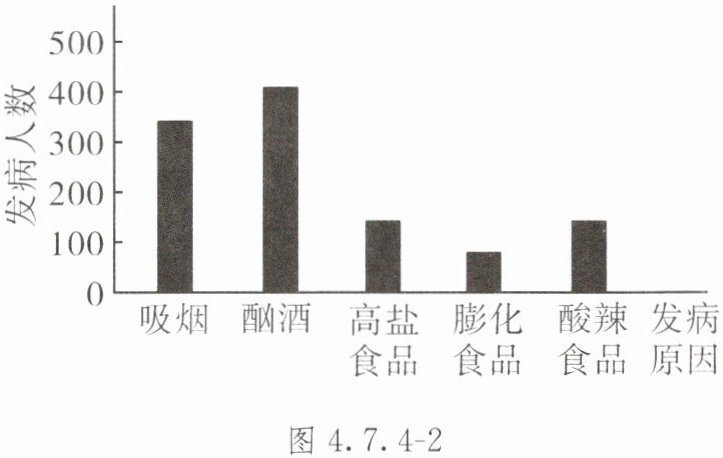 11. 食管癌是世界范围内常见的消化道恶性肿瘤之一。据了解,诱发食管癌的因素有不健康饮食、不良生活习惯、肿瘤家族史、基础疾病及肥胖等。图4.7.4 - 2是研究人员对1200名食管癌患者发病原因调查得到的数据。据图回答下列问题。