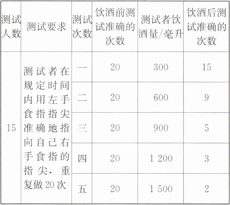 |测试人数|测试要求|测试次数|饮酒前测试准确的次数|测试者饮酒量/毫升|饮酒后测试准确的次数|