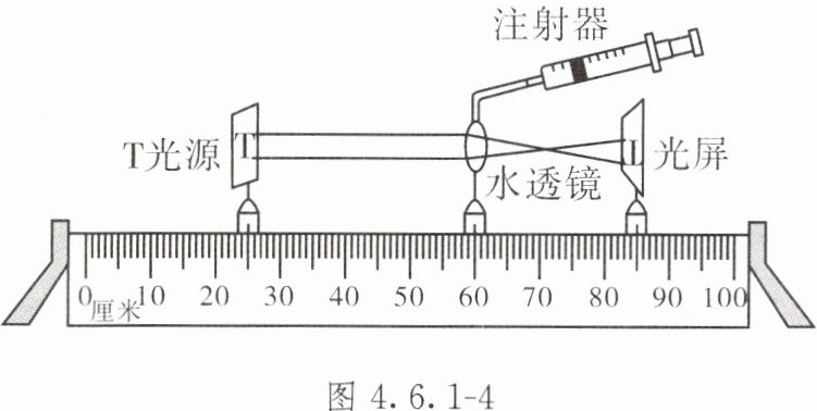 13. (2023·广西)每年的 6 月 6 日为“全国爱眼日”,为了理解用眼卫生保健知识,老师组织同学们依据物理成像原理制作了一个可调节的眼球结构成像模型。用注射器控制水透镜中水的含量,调节水透镜的曲度(向内推注射器加水,水透镜曲度变大,向外拉则变小),改变成像的焦距。图 4.6.1-4 表示正常眼球的成像。下列叙述正确的是( )。