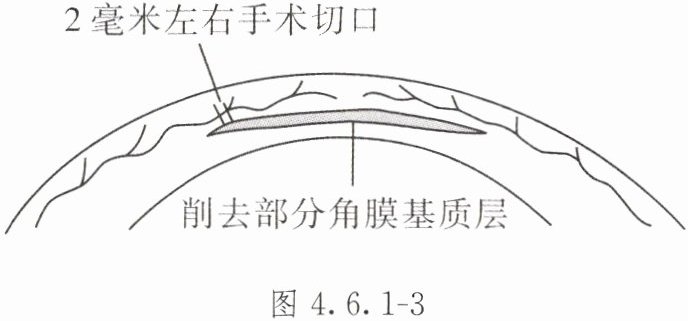 材料 全飞秒近视手术,是利用飞秒激光削掉一部分角膜基质层,再通过一个 2 毫米左右的微小切口将之取出(如图 4.6.1-3),从而改变角膜曲度,达到矫正视力的目的。近视度数越大,需要切除的角膜基质层越厚。每矫正 100 度的近视,会削掉厚度为 10~15 微米的角膜基质层。术后角膜厚度大于 400 微米不易出现风险。