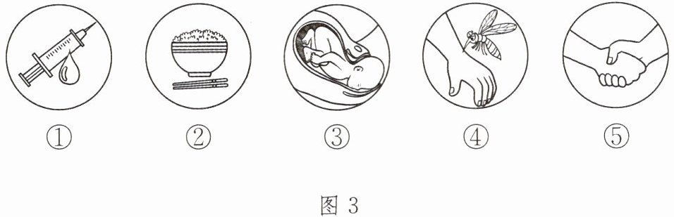 (4)为预防某些传染病的传播,可对易感人群进行预防接种,但目前科研人员尚未研制出可临床使用的艾滋病疫苗,艾滋病病毒会侵犯并破坏人体的______系统,使人体不能抵御病原体。下列行为(图 3)中,不会感染艾滋病的是______(填序号)。